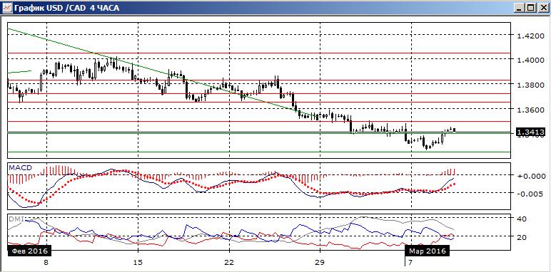 На четырёхчасовом графике пара преодолела уровень 1,3400, тем самым преодолён и предыдущий относительный максимум, что может говорить о развороте, по крайней мере коррекционном. Так же пара выше нескольких вариантов краткосрочного нисходящего тренда. По индикаторам направленного движения тенденцией стал рост — DM+ выше DM-, гистограмма MACD растёт в положительной зоне, линия MACD направлена вверх. Целью коррекции видится уровень 1,3500 — здесь сопротивление для роста должно быть сильнее.