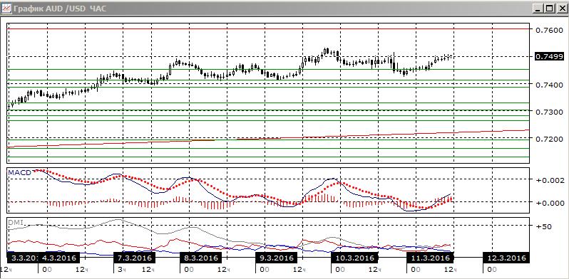 На дневном графике пара вновь растёт выше 0,7450. Разворота не произошло, и уровень 0,7450 можно рассматривать как ближайший уровень поддержки. В остальном ситуация остаётся прежней — тенденция роста сохраняется, она очень сильная. Последовательность роста относительных минимумов и максимумов пары не нарушена. По индикаторам направленного движения тенденция роста сохраняется: превышение DM+ над DM- большое при росте ADX, гистограмма MACD в положительной зоне, линия MACD сохраняет положительный наклон. Рост по-прежнему видится предпочтительным, с целью на 0,7600.