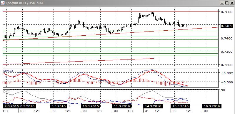 На часовом графике относительные максимумы и минимумы пары снижаются, тенденцией и по индикаторам направленного движения стало снижение. Но оно замедляется, пара вернулась к 0,7500. Новые минимумы пары не подтверждаются новыми минимумами гистограммы MACD. Это, вместе с приближением к линии тренда, создает возможность для возобновления роста пары от линии тренда, если она закрепится выше 0,7500.