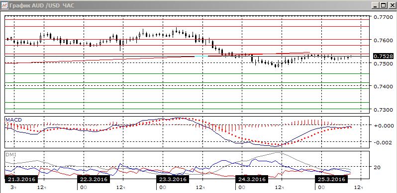 На четырёхчасовом графике видно, что около 0,7655 образовался двойной максимум, далее был преодолел промежуточный уровень поддержки на 0,7575. Пара достигла целевого уровня движения при двойном максимуме (около 0,7500), где и получила поддержку. Отскок вверх, однако, не развивается. Пара снижается сейчас, и это подтверждается индикаторами направленного движения - DM- выше DM+, гистограмма MACD находится в отрицательной области, линия MACD также снижается. Скорее, в ближайшей перспективе снижение продолжится с целью на 0,7415.