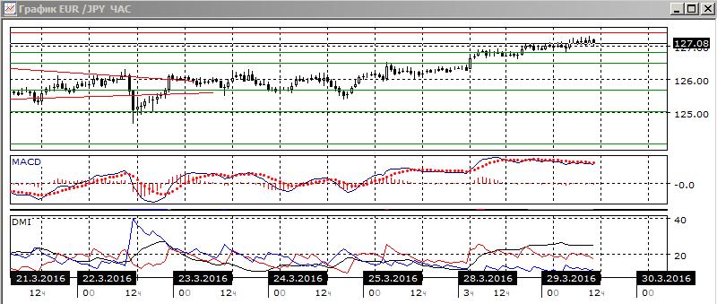 На четырёхчасовом графике пара находится выше сопротивления на 127,00. Так как пара находится около вершины 11-14 марта, возможны два варианта: или образование двойной вершины и откат от 127,40, или закрепление выше этого уровня, что может стать катализатором дальнейшего роста пары. По ADX тенденция роста усиливается, превышение DM+ над DM- увеличивается при росте ADX. Относительные максимумы и минимумы пары растут.
