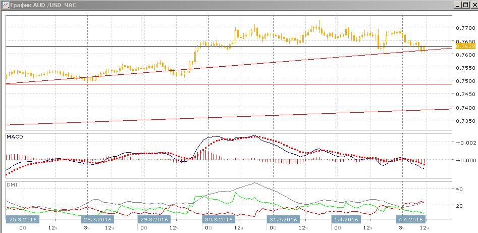 На дневном графике пара снизилась до краткосрочной линии восходящего тренда, а также «круглого» уровня 0,7600. По гистограмме MACD пара уже перешла к снижению — гистограмма снижается в отрицательной области, линия MACD имеет отрицательный наклон. Это указывает на возможное продолжение снижения в ближайшей перспективе. Тенденция, однако, пока не нарушена: последовательность относительных максимумов и минимумов пары не нарушена, по ADX тенденция остаётся сильной и устойчивой. Скорее, ближайшая перспектива определится с тем, получит ли пара поддержку на уровне краткосрочного тренда, или закрытие будет ниже него. Во втором случае целью будет выглядеть уровень около предыдущего относительного минимума — 0,7485.