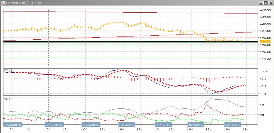На часовом графике пара после снижение от 128,00 находится в диапазоне 125,35-126,00. Скорее, дальнейшее движение пары будет в сторону выхода из этого диапазона. Предпочтителен выход вниз, в сторону предшествующего движения.