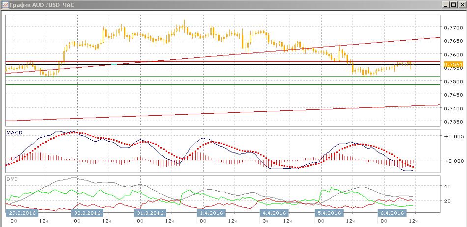 На часовом графике, кажется, пара переходит к снижению от 0,7570, после того как этот уровень тестировался. Так как волна роста от 0,7515 скорее была коррекционной, целью сейчас видится снижение к исходному уровню коррекции на 0,7515.