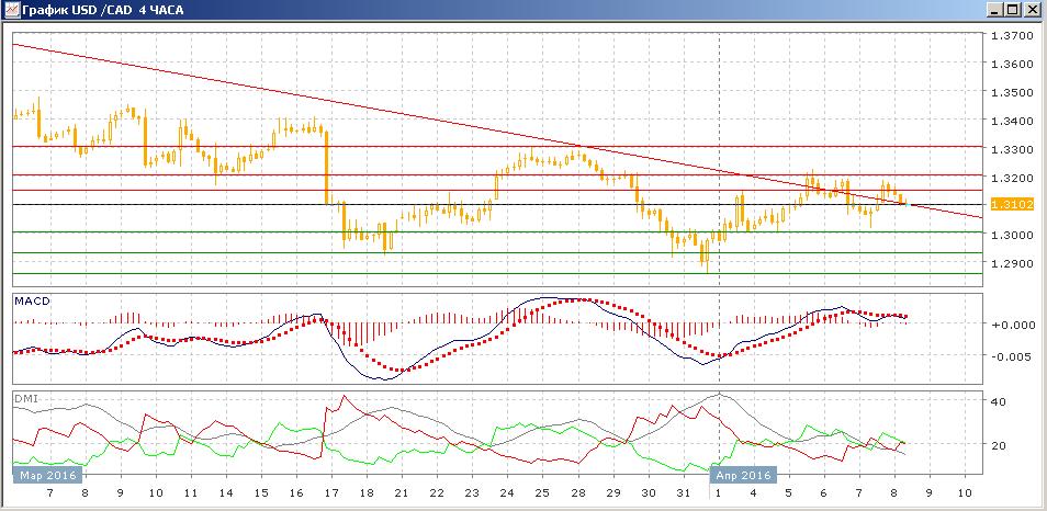 На четырёхчасовом графике около 1,3200 образовалось три относительных максимума, что должно усилить этот уровень сопротивления. Однако пара выше линии тренда и выше ключевого уровня поддержки 1,3000. По индикаторам направленного движения тенденции нет: гистограмма MACD колеблется около нуля, DM+ и DM- близки, ADX снижается. Поэтому ситуация, скорее, нейтральная и стоит подождать появления тренда.