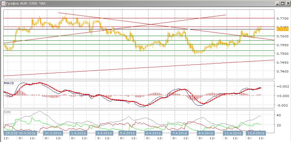 На четырёхчасовом графике пара перешла к росту: от 0,7500 относительные максимумы и минимумы пары последовательно растут, пар выше краткосрочной линии нисходящего тренда с начала апреля. После его преодоление (и одновременно преодоления уровня 0,7600) пара получила на этом уровне поддержку. Скорее, в ближайшей перспективе рост более предпочтителен с целью на следующем «круглом» уровне 0,7700. Подобная картина и на часовом графике. Пара находится выше максимумов 6 и 7 апреля, и скорее рост до следующего уровня сопротивления 0,7700 продолжится.