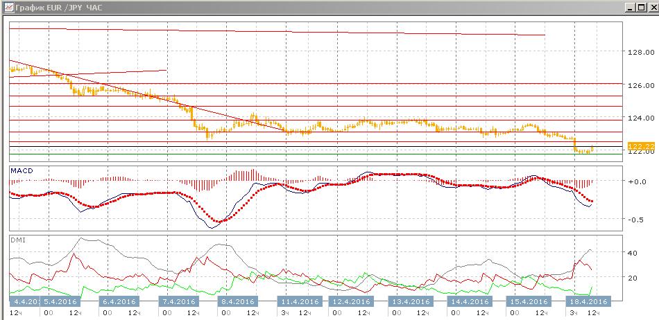 На дневном графике пара преодолела уровень 123,10, закрытие было ниже, и достигла минимума февраля на 122,08, сейчас пара ниже этого уровня. Пара находится на долговременном минимуме, поэтому при закрытии ниже 122,08 близкой поддержки не видно. Если предположить трёхволновое движение от 128,00, то целью видится зона около 119. Ио индикаторам направленного движения тенденция снижения сильная — DM- значительно выше DM+ при росте ADX, гистограмма MACD снижается в отрицательной области, линия MACD имеет отрицательный наклон.