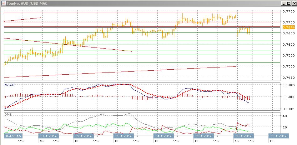 На четырёхчасовом графике пара вернулась в канал между 0,7485 и 0,7700. Пара получила поддержку на 0,7650. Возвращение в канал делает предпочтительным снижение пары до нижней границы 0,7485. По индикаторам направленного движения тенденцией стало снижение — DM- выше DM+, гистограмма MACD снижается в отрицательной области, линия MACD развернулась вниз.