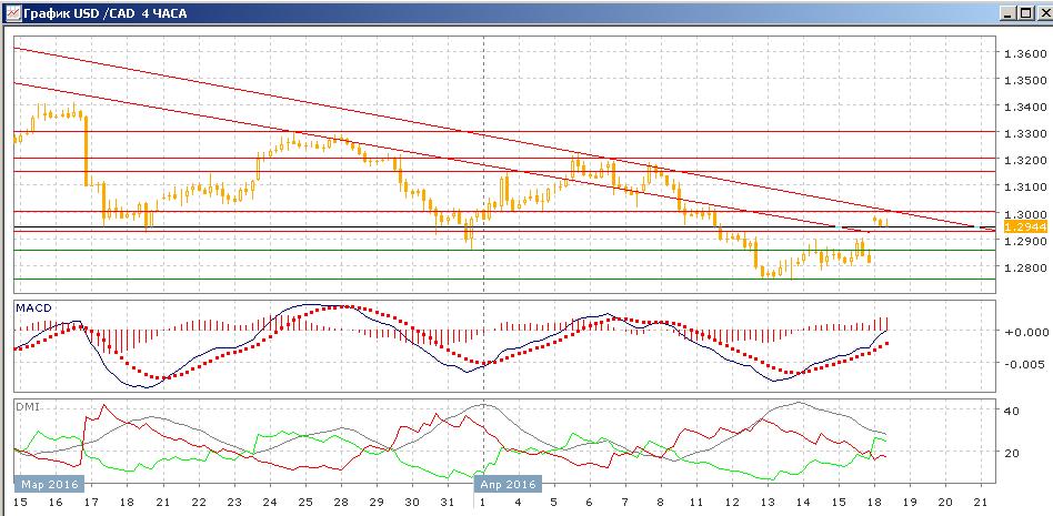 На четырёхчасовом графике продолжается рост пары от 1,2750. Преодолена двойная вершина на 1,2900. Относительные максимумы и минимумы пары растут. Пока пара выше 1,2900, то есть гэп не закрыт, продолжение роста в краткосрочной перспективе видится предпочтительным. Определённее в пользу продолжение роста будет преодоление уровня сопротивления на 1,3000, там же находится один из вариантов линии тренда, поэтому до преодоления этого уровня на рост выше 1,3000 рассчитывать рано.