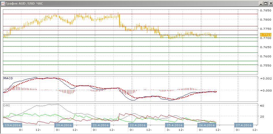 На четырёхчасовом графике сохраняется консолидация выше 0,7700. Учитывая верхние тени свечей, это говорит об отсутствии поддержки для роста, и то, что отскок от 0,7700 принял форму остановки на уровне, скорее снижение пары возобновится. При преодолении уровня 0,7700 следующей целью видится уровень 0,7620 (поддержка около середины апреля). На часовом графике также видна консолидация выше 0,7700, выход из консолидации предпочтителен вниз, в направлении предшествующего движения.