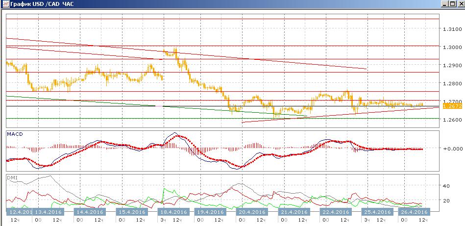На часовом графике можно рассматривать краткосрочный треугольник между восходящей линией тренда от 1,2600 и уровнем 1,2700, скорее всего движение будет в сторону выхода пары из этого треугольника.