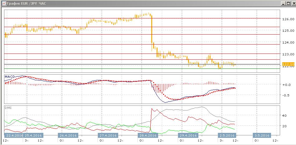 На четырёхчасовом графике пара снижение приостановилось и образовалась консолидация в границах 121,75-122,50. Более вероятный выход из неё — вниз, в направлении предшествующей тенденции. Увеличивает силу поддержки минимум апреля на нижней границе. По ADX тенденция снижения сильная, гистограмма MACD остаётся в отрицательной зоне, её рост показывает замедление тенденции. Скорее, ближайшей целью является новое тестирования нижней границы консолидации, а более значительное движение будет в направлении выхода из консолидации.