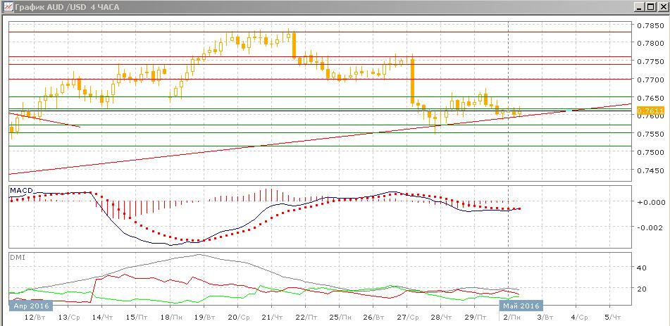 На дневном графике пара остаётся выше линии восходящего тренда, рост ограничивается уровнем 0,7650. По индикаторам направленного движения тенденция снижения сохраняется: DM- выше DM+, гистограмма MACD снижается в отрицательной области, линия MACD имеет отрицательный наклон. Относительные минимумы и максимумы пары снижаются. Скорее, стоит действовать в направлении выхода пары либо ниже линии тренда, либо выше уровня 0,7650.