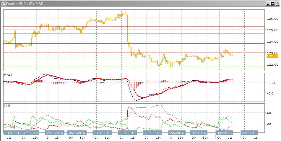 На четырёхчасовом графике пара продолжает тестировать снизу уровень сопротивления на 123,00 — около него два относительных минимума и прокол в начале дня. Закрепления пары выше этого уровня не было, но постепенный рост минимумов пары делает выход выше 123,00 более предпочтительным, так как перехода снижению не последовало. Относительные максимумы и минимумы пары начали расти. По ADX тенденцией стал рост, гистограмма MACD растёт в положительной зоне. Для того, чтобы рассчитывать на рост пары, необходим закрепление выше 123,00. На часовом графике похожая ситуация: уровень 123,00 продолжает тестироваться.