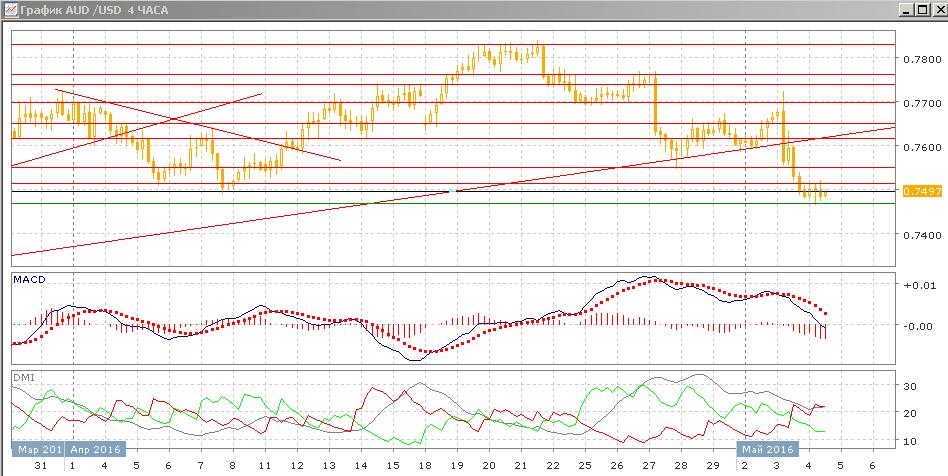 На четырёхчасовом графике пара после резкого снижения от 0,7700 консолидируется около 0,7500, ниже 0,7515. Так как консолидация происходит ниже важного уровня поддержки (около 0,7500 относительные минимумы начала апреля), по скорее снижение будет продолжаться, так как рынок не подержал даже коррекционное движение вверх. По индикаторам направленного движения и в этом масштабе тенденцией стало снижение.