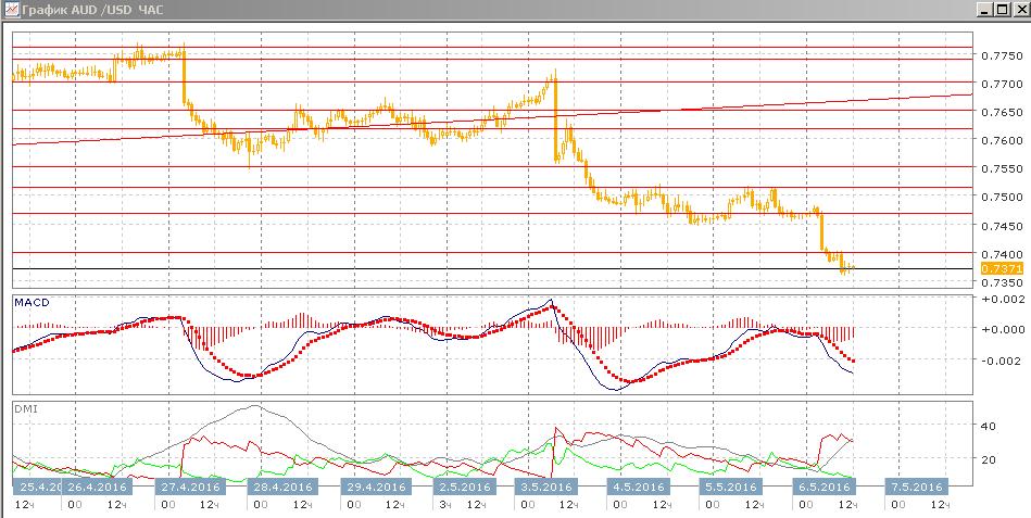На дневном графике после закрепления ниже линии тренда пара продолжила снижение. Достигнут очередной «круглый» уровень 0,7400. Относительный минимум начала апреля 0,7515 выступил сопротивлением при отскоке от 0,8475. Относительные максимумы и минимумы пары снижаются, тенденция снижения усиливается. По индикаторам направленного движения это видно по увеличению превышения DM- над DM+, продолжению снижения гистограммы MACD в отрицательной области, увеличении отрицательного наклона линии MACD. Пара достигла важной зоны поддержки, на относительных максимумах октября и декабря прошлого года. Около 0,7200 находится еще более сильная зона поддержки/сопротивления. Учитывая, что от максимума апреля пара снизилась более чем на 400 пунктов, возможно текущая волна снижения скоро сменится отскоком (но пока на то рассчитывать, кажется, преждевременно).