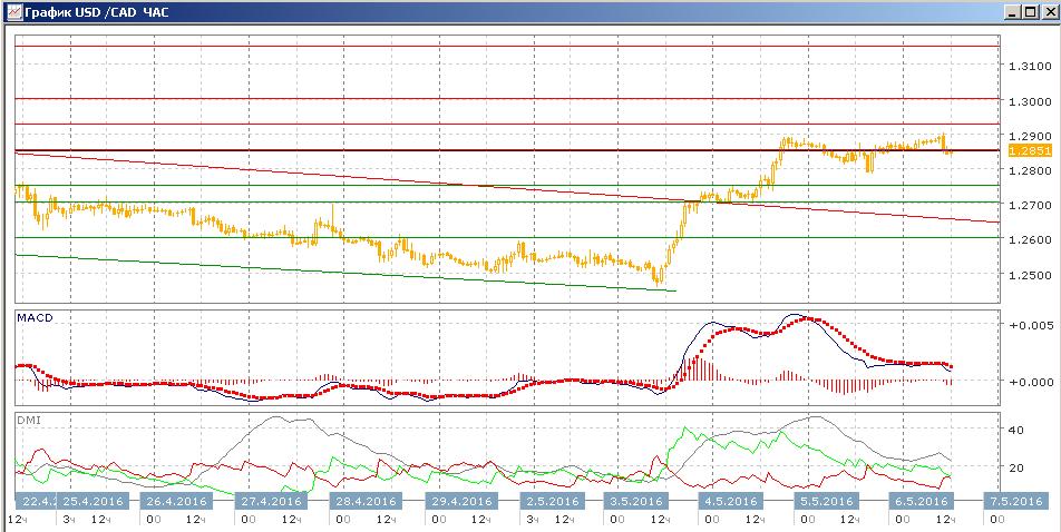 На четырёхчасовом графике пара встречает сопротивление у 1,2900 и поддержку на 1,2800. рост остаётся сильной тенденцией, последовательность роста относительных максимумов и минимумов пары не нарушена. Рост замедлился, и около 1,2900 возможно образование двойной вершины. Подтверждение этой разворотной модели было бы снижение ниже 1,2800, пока же возобновление роста видится предпочтительным. На часовом графике такая же картина — при сохранении тенденции роста, необходимо закрепление выше 1,2900, чтобы рассчитывать на его продолжение.