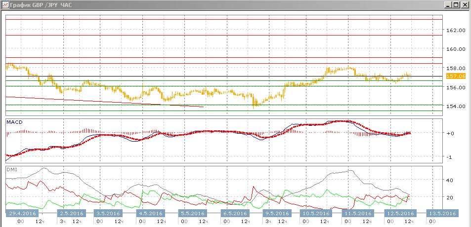 На четырёхчасовом графике происходит снижение от 158,45. Его можно рассматривать как коррекционное к волне роста от 154,00. При снижении пара получила поддержку на 156,60, этот уровень пока устойчив. Более сильный уровень поддержки ниже, на 156,00, около максимумов начала мая. Последовательность роста относительных минимумов пары пока не нарушена. Предпочтительным сейчас видится возобновление роста пары.