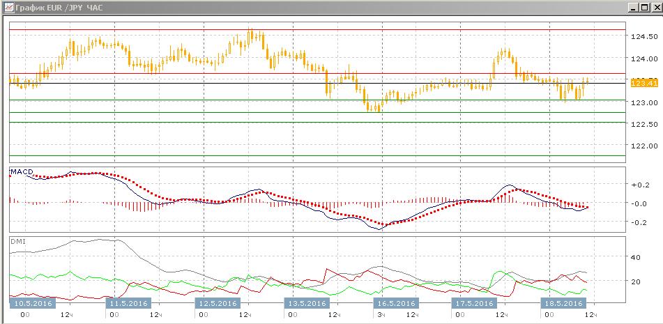 На дневном графике пара ситуация в целом не изменилась: пара остаётся в диапазоне, выше сильной зоны поддержки около 121,75, но ниже сопротивления на 124,65. Долгосрочной тенденцией является снижение — важные максимума (в конце января, марта, апреля) постепенно снижаются. По индикаторам направленного движения отсутствие тенденции сохраняется: гистограмма MACD колеблется около нуля, меняет направление линия MACD, DM- и DM+ близки. Исходя из того, что коррекционное движение вверх от 121,75 не превратилось в разворот и пара не достигла цели на уровне исходной точки волны снижения, возможно зона около 122,00 вновь будет тестироваться. Для коррекционного движения к снижению пары от 126 до 121,75 волна роста затягивается, но и в росту пара также не перешла. Скорее, переход к росту подтвердило бы закрытие выше относительно максимума середины мая на 124,65. Закрепление ниже 123,00 сделало бы предпочтительным завершение коррекционного движения.