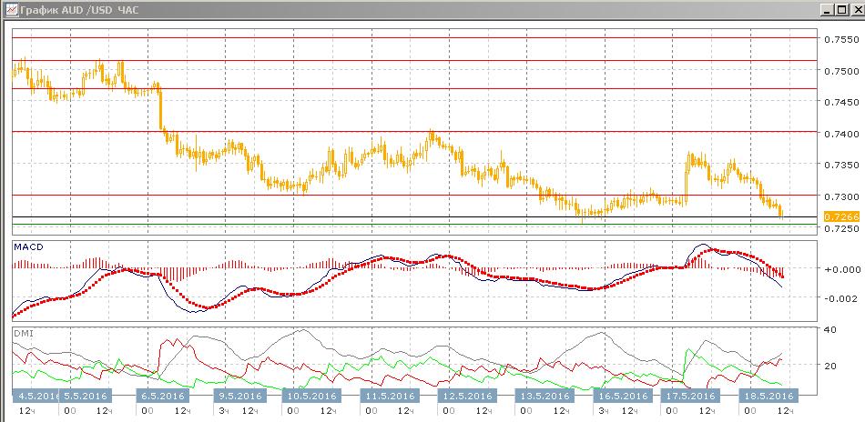 На четырёхчасовом графике пара коррекционная волна роста почти завершилась, пара возвращается к исходной точке роста около 0,7250. Этот уровень видится ближайшей целью для пары. В целом снижение замедляется — это видно по уменьшению наклона графика, а по индикаторам направленного движения проявляется в том, что выраженной тенденции по индикаторам направленного движения нет. Исходя из того, что тенденция снижения сохранятся (относительные максимумы пары снижаются, пара достигает новых минимумов), скорее снижение будет продолжаться.