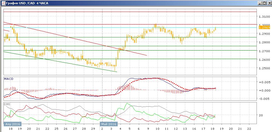 На четырёхчасовом графике пара растёт от 1,2855. Уровень пары предыдущих относительных максимумов достигнут, и скорее рост пары продолжится до ключевого уровня сопротивления 1,3000. Важный относительные минимумы, 5 и 12 мая показывают сильную поддержку на 1,2800. Пока ситуация была, скорее, нейтральной — снижение относительных максимумов с 9 мая и рост относительных минимумов с с 3 мая создавали краткосрочно нейтральную ситуацию, но рост пары выше предыдущих относительных максимумом сделал продолжение роста предпочтительным.