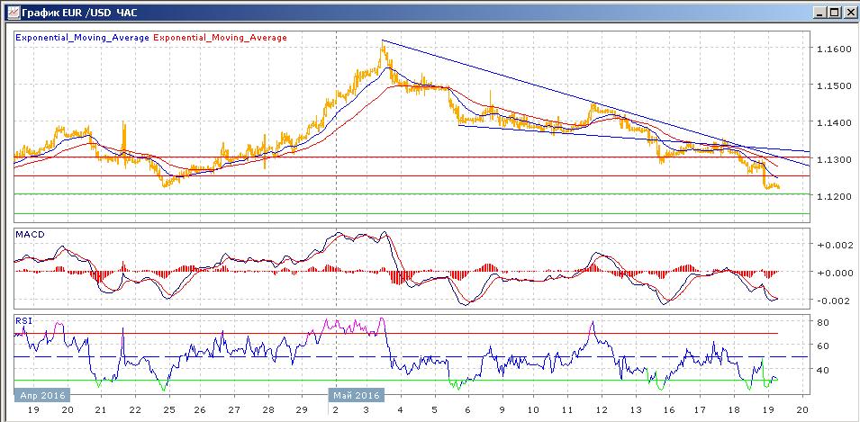 пара продолжает начатое 3 мая снижение. Во вторник пара закрылась почти без изменений, испытывая сопротивление от нисходящей линии тренда. Вчера пара потеряла порядка 100 пунктов, закрывшись на 1.1216, новом 3-недельном минимуме. Сегодня пара торгуется на уровне открытия. Средние скользящие ЕМА21 и ЕМА55 направлены вниз и снижаются. Индикаторы MACD и RSI со вторника находятся ниже своих центральных линий и сегодня склонны к снижению, RSI входит в зону перепроданности. Цели вверх: 1.1250, 1.1300. Цели вниз: 1.1200, 1.1150
