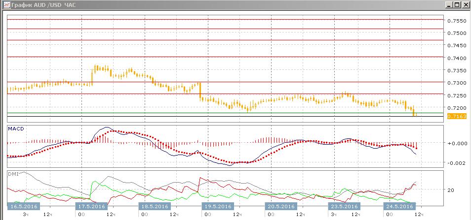 На часовом графике пара преодолела относительный минимум 19 мая, от 0,7250 снижение продолжатся, относительные минимумы и максимумы пары последовательно снижаются. По ADX тенденция снижения стала сильной. Скорее, снижение будет продолжаться.