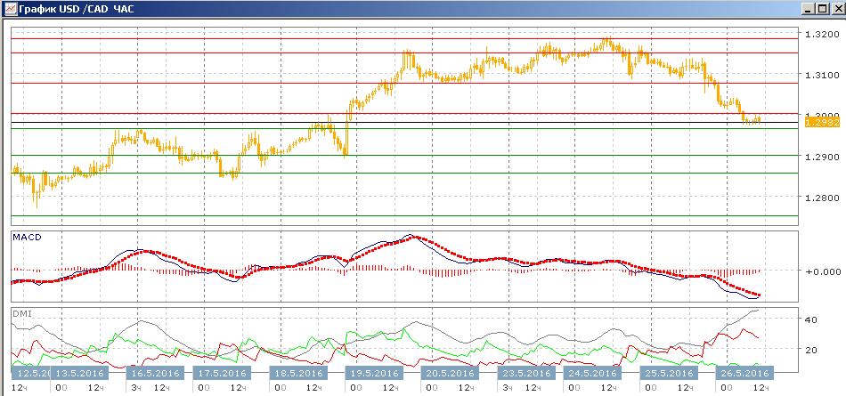 На четырёхчасовом графике переход пары к снижению уже произошёл. Между 1,3150 и 1,3200 образовалась полукруглая вершина, что само по себе может быть признаком разворота с перспективой. Пара преодолела зону поддержки на 1,3075-1,3100, однако движение было быстрым и пара достигла следующего уровня поддержки на 1,2965. Этот уровень проявлялся как сопротивление в начале и середине мая. Однако, продолжение снижения сейчас видится предпочтительным. По индикаторам направленного движения тенденция снижения усиливается: превышение DM- над DM+ увеличивается, гистограмма MACD снижается в отрицательной области, линия MACD имеет отрицательный наклон.