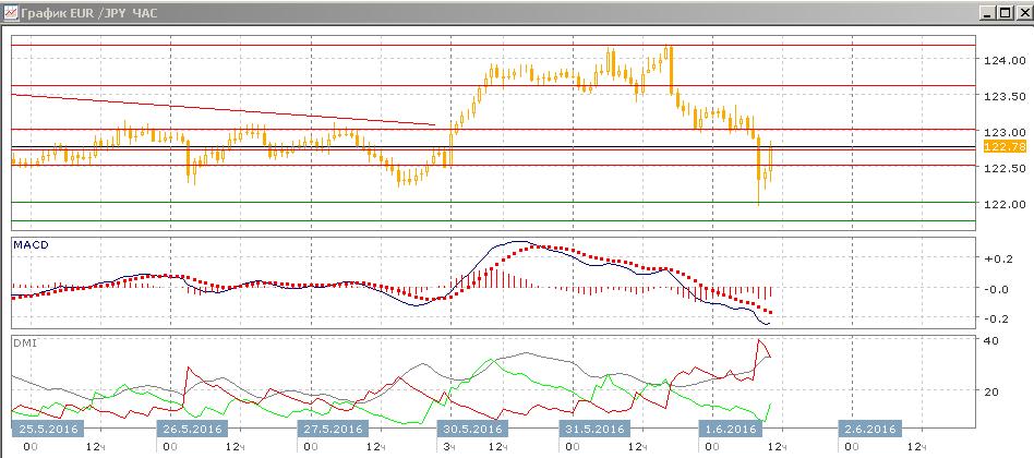 На четырёхчасовом графике пара снижается после выхода из флага между 123,60 и 124,00 вниз. Однако при снижении, когда пара достигла 122,00, она вернулась выше пары предыдущих относительных минимумов, 26 и 27 мая. Быстрое восстановление пары может показывать, что движение было импульсивным и, возможно, не имело под собой существенных оснований, раз укрепление иены ниже 110 по USD/JPY быстро сменилось продажей. Дальнейшее развитие событий, скорее, будет зависеть от того, вернётся ли пара обратно, выше 122,50. Если так, то будет хорошо выраженная картина ложного пробоя уровня, перед которым уже образовалось три вершины. Однако закрепление ниже 122,50 показало бы, что сильная поддержка преодолена. Скорее, более выгодно подождать. Относительные минимумы и максимумы пары теперь снижаются, по индикаторам направленного движения пара перешла к снижению.
