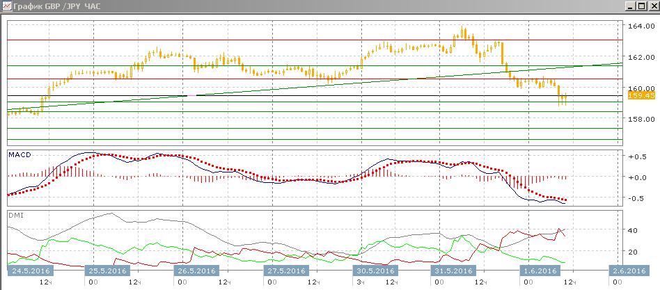 На дневном графике пара снизилась от важного уровня сопротивления 163,00, он ограничивал рост пары с марта. Вторым важным обстоятельство является возможное преодоление сегодня восходящего тренда с 6 мая. Пара уже ниже предыдущего относительного минимума, поэтому вероятность разворота вниз увеличивается. В рамках движения между важными уровнями сопротивления и поддержки цель может стать снижение до 156,00, там рядом относительный минимум 23 мая. По индикаторам направленного движения тенденции уже не видно DM+ и DM- вновь сблизились, гистограмма MACD вернулась к околонулевому уровню.