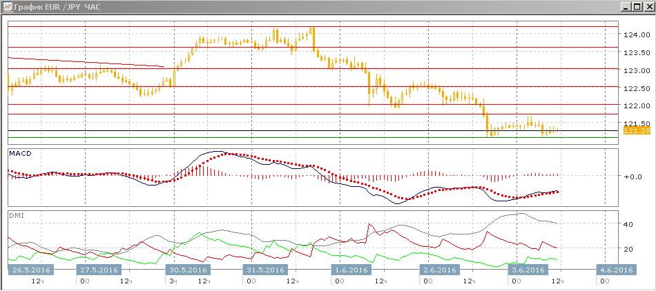 На четырёхчасовом графике продолжается снижение от 124,20. Предыдущий уровень поддержки на 121,75 уже выступил сопротивлением после того, как откат вверх был приостановлен ниже этого уровня. Относительные максимумы и минимумы пары продолжают снижаться. По ADX тенденция снижения является сильной: превышение DM- над DM+ большое и увеличивается, при росте ADX. Линия MZCD снижается, гистограмма MACD находится в отрицательной области. Закрепление пары ниже 121,75 делает продолжение снижения предпочтительным вариантом. Цели сейчас не видно, так как пара на долговременном минимуме. При такой сильной тенденции скорее снижение будет продолжаться.