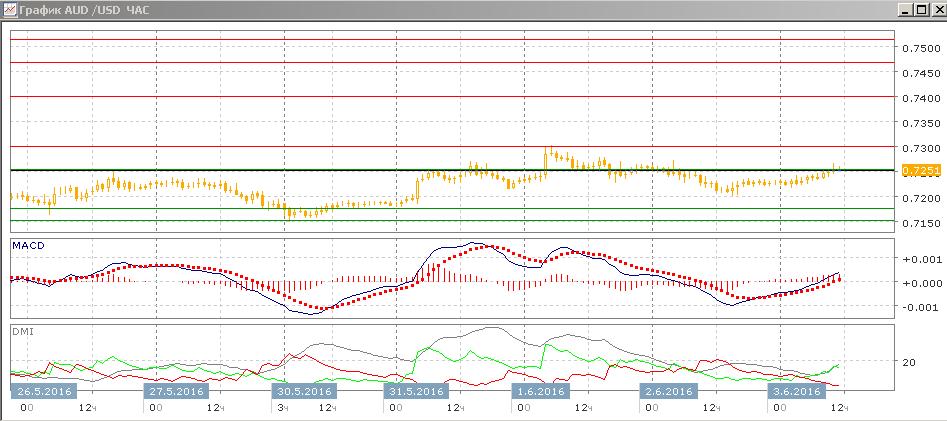 На часовом графике пара растёт. Дальнейшая перспектива зависит от того, закрепится ли она выше 0,7250. Если да, ближайшей целью для пары видится уровень 0,7300, если будет откат — то 0,7250 и далее 0,7150.