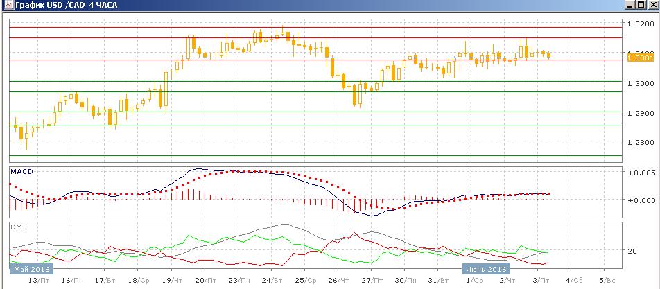 На четырёхчасовом графике рост пары приостановился — пара откатывается от 1,3100, относительные минимумы пары растут. Гистограмма MACD на околонулевом уровне, что говорит о приостановке движения. Так как пока относительные максимумы и минимумы пары растут, то продолжение роста видится предпочтительным. Однако сейчас для этого необходимо хотя бы закрепление выше 1,3100. Перспектива роста также не выглядит значительной — на на 1,3150 сильный уровень сопротивления, на 1,3185 — максимум мая.