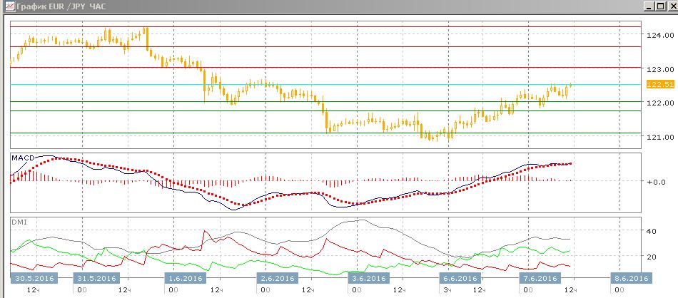 На четырёхчасовом графике пара перешла к росту, после преодоления уровней 121,75 и 122,00 следующей целью видится сопротивление на 123,00, так как этот уровень проявился как поддержка и сопротивление в мае. По индикаторам направленного движения рост также стал тенденцией: DM+ сейчас выше DM-, гистограмма MACD растёт в положительной зоне, линия MACD получила положительный наклон. Краткосрочный тренд снижения от 124,20 преодолён. Размер коррекции сейчас составляет около 50%. В ближайшей перспективе рост, скорее, продолжится до 123,00, но для дальнейшего роста необходимо закрепление выше этого уровня.