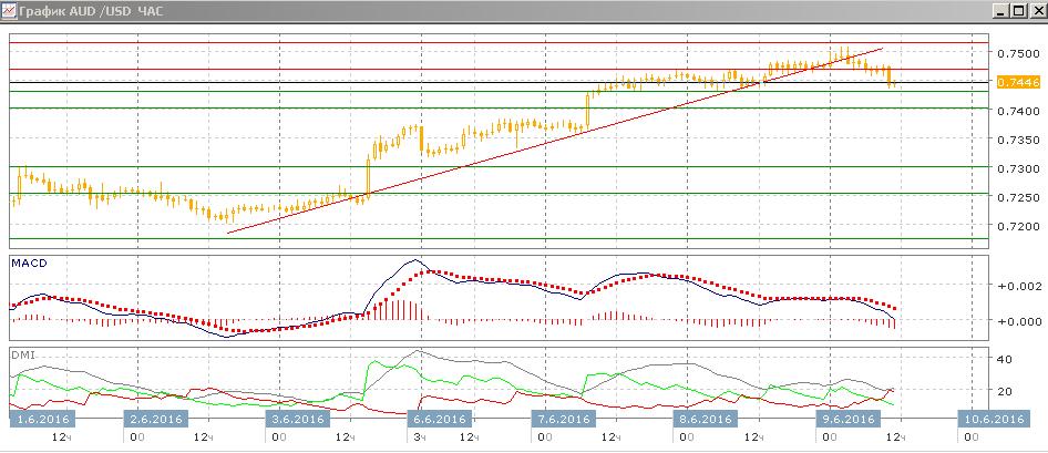 На четырёхчасовом графике, возможно, образуется вершина. Пара быстро снизилась от 0,7500, и вернулась ниже уровня сопротивления на 0,7470. Образовалось тройное медвежье расхождение максимумов пары и гистограммы MACD. Последовательность роста относительных максимумов и минимумов пары сохраняется, но краткросрочная линия тренда была преодолена, что делает вероятном продолжение снижения. По индикаторам направленного движения видна коррекция к росту : тенденция остаётся сильной, превышение DM+ над DM- значительное и устойчивое, но гистограмма MACD уже снижается в отрицательной области, а линия MACD развернулась. Откат от уровня 0,7500 с преодолением краткосрочной линии тренда хорошо виден и на часовом графике.