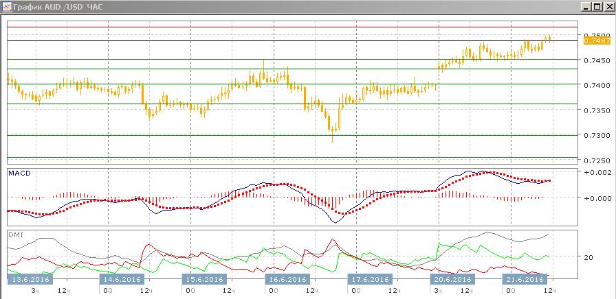 На часовом графике пара растёт от 0,7450, уровень сначала был сопротивлением, а потом поддержкой в середине и конце понедельника. Тенденцией является рост пары, относительные минимумы растут от 0,73 и скорее рост пары продолжится. Превышение DM+ над DM- является большим и устойчивым. Перед 0,7500 тенденция замедляется, образовалось медвежье расхождение максимумов пары и гистограммы MACD. При откате от 0,7500 ближайшей целью стал бы уровень поддержки на 0,7450. До закрепления выше 0,7500 рассчитывать на рост выше этого уровня сейчас кажется слишком рискованным, так как уровень сопротивления сильный.