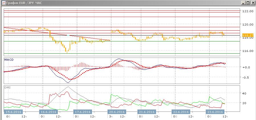На дневном графике пара приостановила снижение и поддержкой в течение трёх сессий выступал уровень 117,35. Пара достигла уровня 119,00, но остаётся ниже предыдущего относительного максимума. По индикаторам направленного движения происходит коррекция к снижению — тенденция снижения сохраняется, DM+ значительно выше DM-, рост ADX продолжается. Коррекция видна по росту гистограммы MACD, но она остаётся в отрицательной зоне. Верхние тени свечей показывают, что рост продаётся. Референдум в Великобритании может быть поворотной точкой — пара может как развернуться вверх, так и возобновить снижение.