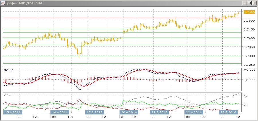 На часовом графике похожая картина: пара консолидируется выше 0,7515, уровень выступает уже уровнем поддержки. Последовательность роста относительных максимумов и минимумов пары сохраняется. Превышение DM+ над DM- большое и устойчивое. Продолжение роста выглядит предпочтительным.