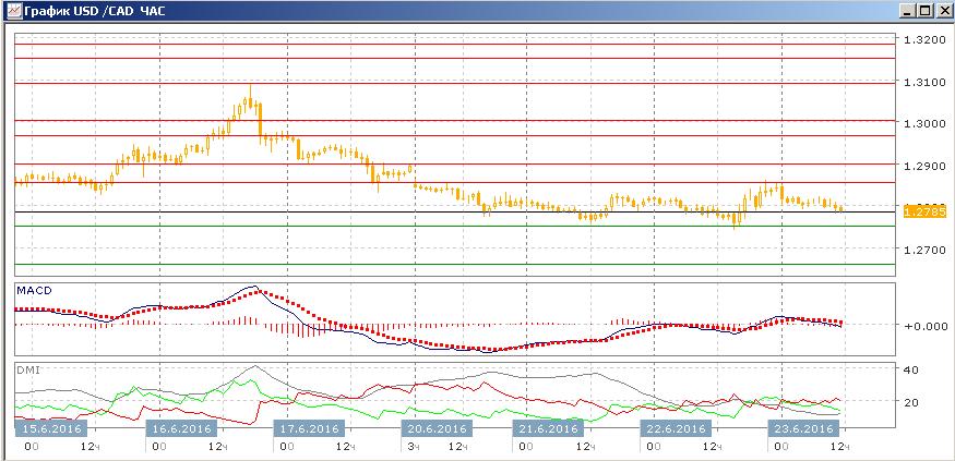 На четырёхчасовом графике центр колебаний — 1,2800, можно представить расходящийся треугольник (относительные минимумы снижаются, относительные максимы растут). Так как треугольник — фигура продолжение, то более вероятен выход из него вниз, в направлении предшествующего движения. По индикаторам направленного движения явной тенденции нет. На часовом графике — скорее флэт с колебаниями около 1,2800. Скорее, пара выйдет из него после референдума в Великобритании. В рамках движения пары в канале 1,2750-1,2855 также предпочтительно снижение к нижней границы, как пара снижается сейчас от верхней границы.