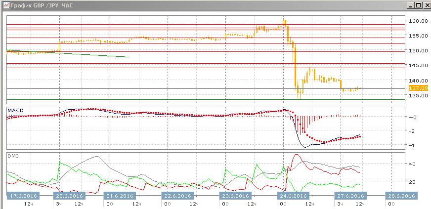 На дневном графике пара рухнула, и неожиданный результат референдума в Великобритании меняет ситуацию с фундаментальной точки зрения, так как это долговременный фактор. Тенденцией остаётся снижение пары. После сильного импульса снижение скорее продолжится, так как признаков разворота или ослабления тенденции не видно.