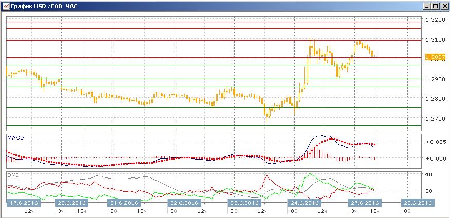 На четырёхчасовом графике на 1,3090 образуется двойная вершина, что делает ближайшей целью промежуточный минимум, около 1,2900. Более долгосрочно, у 1,3090 уже два важных максимума (с середине июня и в пятницу), плюс затянувшееся тестирование в конце мая-начале июня. Это показывать, что уровень сопротивления сильный, и при отскоке вниз от этого уровня он, скорее всего, будет продолжаться. Однако разворота к снижению в этом масштабе пока не было — относительные минимумы пары растут.