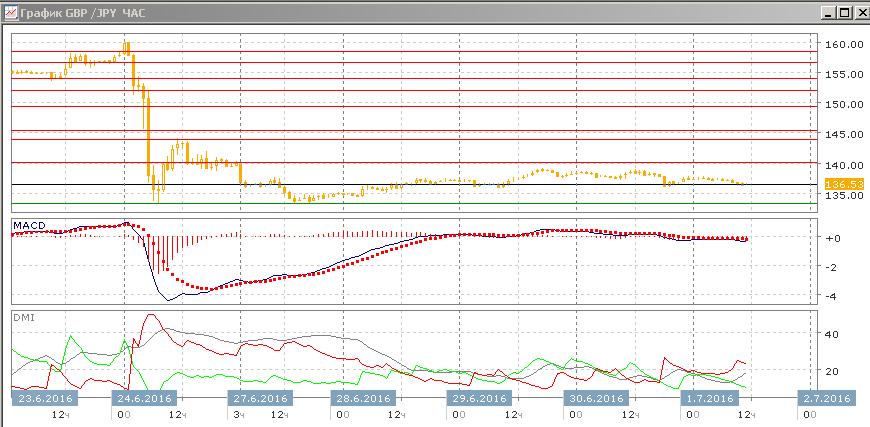 На часовом графике также происходит медленное снижение после приближения пары к 140,00. Тенденция снижения слабая, но оно видно — относительные максимумы и минимумы пары с 29 июня снижаются. Слабость тенденции снижения видна по слабому наклону графика и околонулевой гистограммой MACH, с горизонтальной линией MACD. Исходя из этого, поддержка на уровне минимумов 24 и 27 мая, около 133,25, является для пары существенной.