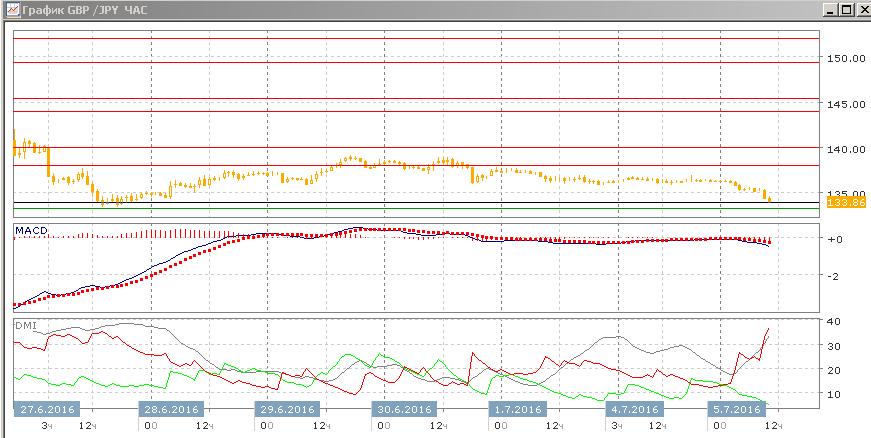 На дневном графике пара приближается к уровню поддержки 133,25, на минимуме, достигнутом после референдума в Великобритании. Как и предполагалось с большей вероятностью, рост после сильного импульса снижения был коррекционным и снижение возобновилось. Скорее, оно будет продолжаться. По индикаторам направленного движения снижение остаётся очень сильной тенденцией: превышение DM- над DM+ очень большое, при росте ADX, гистограмма MACD остаётся в отрицательной зоне, линия MACD сохраняет отрицательный наклон, последовательно снижения относительных максимумов пары сохраняется.