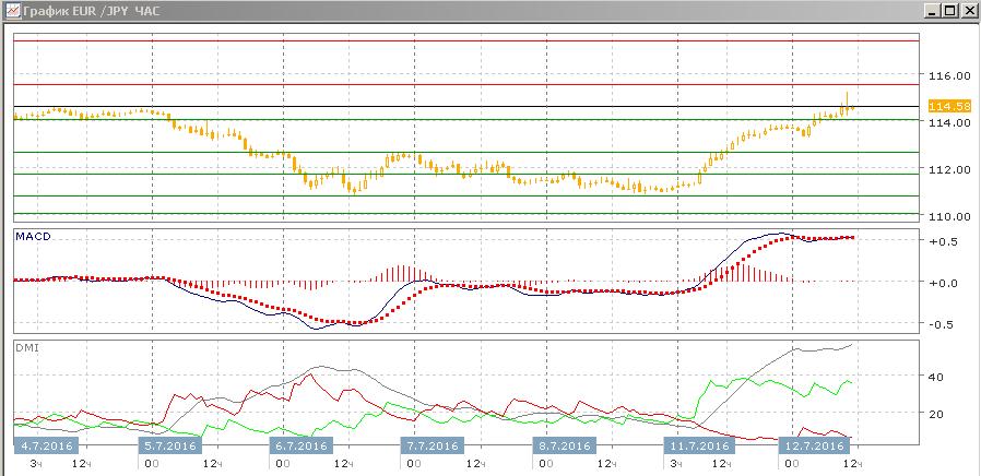 На четырёхчасовом графике пара перешла к росту от 110,80, где образовалось двойное дно. Пара преодолела промежуточный максимум на 112,65 и далее выросла к зоне сопротивления около 114,00, около которой пара торговалась в конце июня — начале июля. Этот уровень быть преодолёт почти без остановки. Исходя из этого, при закреплении выше 115,00 открывается пространство для дальнейшего роста пары к 117,35. Возвращение пары ниже 114,00 вернуло бы пару в диапазон, и сделало более вероятным движение к нижней границе на 110,80.