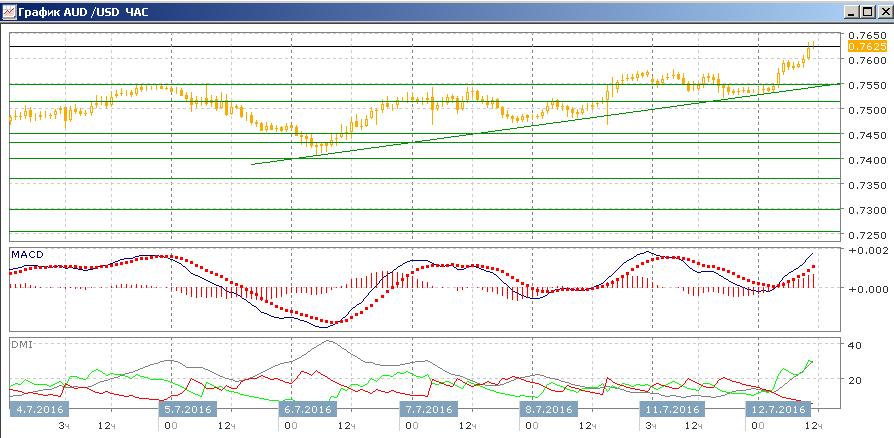 На дневном пара приблизилась к максимуму июня на 0,7650. Уровень предыдущего относительного максимума около 0,7550 преодолён. Пара почти компенсировала снижение после Brexit, и это даёт делает более вероятным возобновление роста, так как показана устойчивость в ситуации «избежания риска». По индикаторам направленного движения тенденция движения слабая, но она имеется — DM+ устойчиво выше DM-, линия MACD сохраняет положительный наклон, гистограмма MACD немного выше нуля. Следующая цель на «круглом» уровне — 0,7700, это уровень сопротивления в конце марта и начале мая.