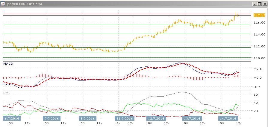 На четырёхчасовом графике рост пары замедлился — после преодоления уровня 115,50, когда он выступил поддержкой при остановке около 116,00, пара выросла до 117,35, но тестирование этого уровня пока не не показывает, что есть поддержка для его преодоления. Образовалось медвежье расхождение максимумов пары и гистограммы MACD, это увеличивает вероятность отката к 115,50. В целом же рост остаётся сильной тенденцией, что видно по большому превышению DM+ над DM-.