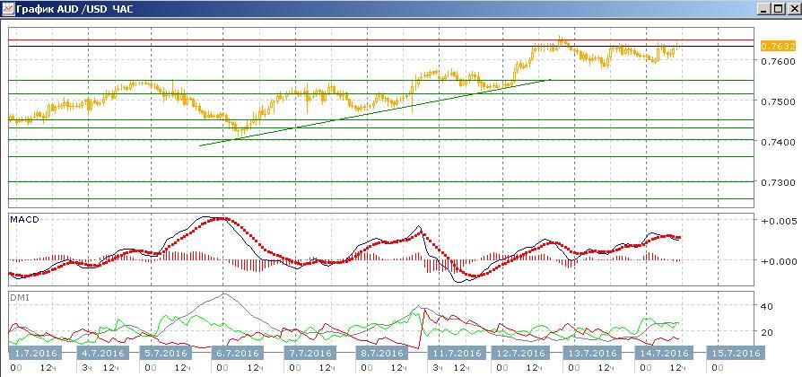 На дневном пара остаётся около максимума июня на 0,7650. Отката от этого уровня не было, уровень 0,7600 можно рассматривать как ближайшую поддержку. Рост пары сейчас видится более вероятным. Последовательность роста относительных максимумов и минимумов после резкого снижения на фоне результатов референдума в Великобритании не нарушена. По индикаторам направленного движения прежняя картина: тенденция движения слабая, однако она является устойчивой. DM+ устойчиво выше DM-, линия MACD сохраняет положительный наклон, гистограмма MACD немного выше нуля. Следующая цель на «круглом» уровне — 0,7700, это уровень сопротивления в конце марта и начале мая.