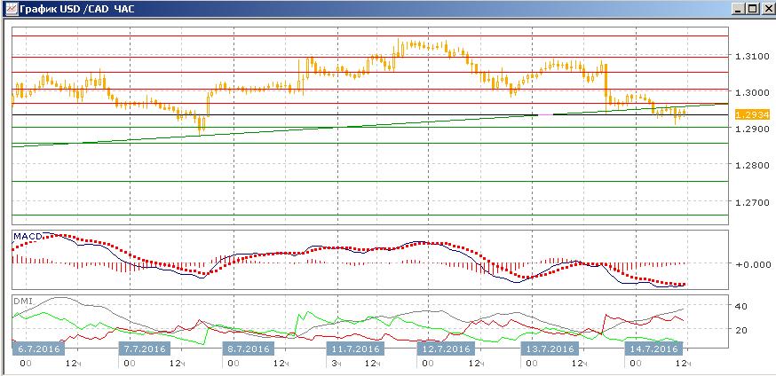 На четырёхчасовом графике пара снижается после приближения к 1,3150, относительные минимумы и максимумы снижаются. По индикаторам направленного движения тенденцией стало снижение (DM- выше DM+, гистограмма MACD снижается в отрицательной области, линия MACD снижается), также преодолена краткосрочная линия восходящего тренда. Нижние тени последних свечей, однако, показывают сопротивление дальнейшему движению, уровень 1,2900 — относительно сильный уровень поддержки.