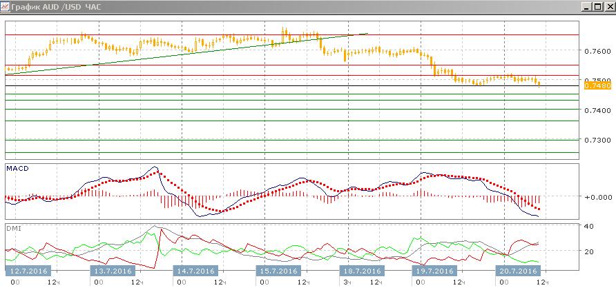На четырёхчасовом графике пара снижается, в волне снижения были коррекции до 0,7600 18 июля и сейчас до 0,7515. Относительные минимумы и максимумы пары последовательно снижаются, коррекция к 0,7515 завершилась. Выход из текущего «флага», скорее, будет вниз, так как это фигура продолжения. По индикаторам направленного движения тенденцией становится снижение — гистограмма MACD снижается в отрицательной области, линия MACD развернулась, DM- уже выше DM+. Ниже текущего уровня существенная поддержка видится только на 0,7400, около относительного минимума 6 июля.