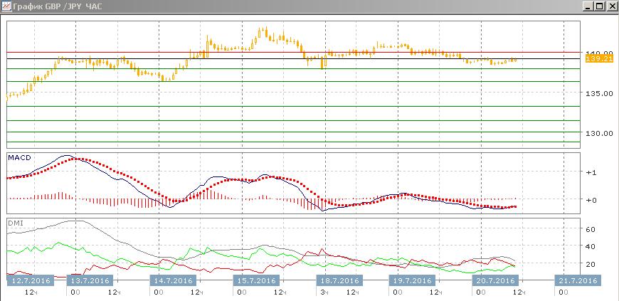 На четырёхчасовом графике относительные минимумы растут, но относительные максимумы снижаются. Это делает ситуацию неопределённой. Переход к снижению был бы видел при преодолении уровня 138,00, на относительном минимуме 15 июля. Так как предыдущий отскок вверх от 138,00 можно рассматривать как коррекционный к снижению, то предпочтительным видится возвращение пары к 138,00, однако дальнейшее будет зависеть от устойчивости этого уровня.